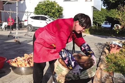 “我这次打算熏90只,家里人喜欢吃。我市场上还有个摊位,顾客吃习惯了,年年到这时候都会来找我买,每年我要卖出1000多只鸡嘞!”性格爽朗的村民叶大姐介绍。