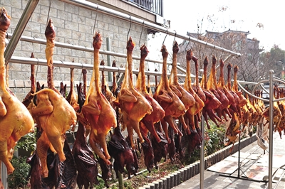 腌好的熏鸡经过三日左右的晾晒,再用特制“秘方”熏烤,便是一道独具特色的美味。