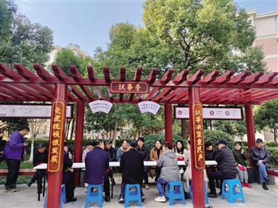 大唐苑社区网格议事亭的前身是小区内部公园一处破旧的闲置亭,而安置房小区居民又普遍喜欢在小公园聚集。大唐苑社区通过微改造,将闲置亭打造成囊括网格议事亭、党员志愿服务点、新时代文明宣传实践点、环卫工人休息接力站、邻里棋艺休闲空间等多项功能的服务区,既具有丁兰特色的公共服务空间,又改善了社区的环境品质,满足群众服务需求。