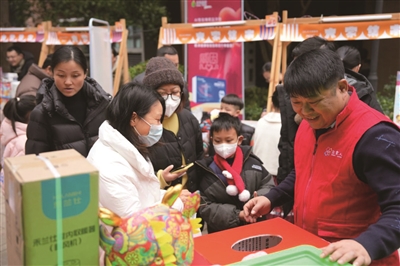 这场搬进小区的“集市”,为商户、小区居民搭建了一个展示商品、努力“搞钱”的平台。集市刚开摊,30余家“摊主”就把自己的明星产品拿出来,商品种类涵盖日化、食品、服装、家居等,从头到脚,从吃到用,应有尽有,居民们在各个摊位前询价购买产品,人来人往邀买争卖,在一阵阵吆喝叫卖中升腾出阵阵人间烟火气。