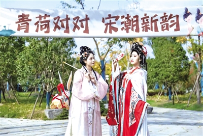 与上城婚姻登记处一步之遥的公园北区——桃芯里婚庆产业园内,也集结了婚礼策划、婚纱摄影、婚礼宴请等婚庆业态。公园定期举办丰富多彩的主题交友活动,从露营风、宋韵风到集体婚礼,无一不在诠释着“爱情”的甜蜜。