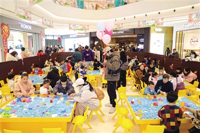 本次“光合生活节”策划出一张“春日寻宝图”,包含丰富多元的互动环节。在商场次中庭,小朋友们手持工具,在沙地里开启创新之旅;在商场与公园的连廊上,市民游客们共同创作颂春诗歌,抒发对春天的赞美;在公园一日居内,老师带领着家长与小朋友,一起开启春日工坊……