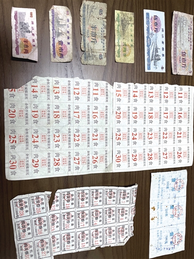 “大队里(村里)会按照人头分发肉票,一些农户往往为了节省点钱,不舍得用,于是,一年一年累积下来,就积攒了很多肉票。这些肉票就是很多农户省下来的,也算是那时候九堡人民生活的一种真实写照吧。”毕功庆说。