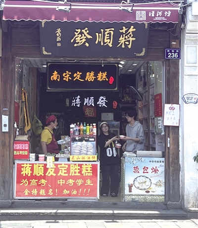 本报讯(区文商旅集团 清波街道) 2024年高考临近。一块热腾腾的定胜糕,是“高考经济”最鲜活的元素之一。近日,河坊街的“蒋顺发”定胜糕店生意可谓十分红火。
