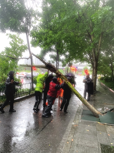 笕桥街道全天出动应急队伍及社区应急力量,在辖区路面开展不间断巡查,处置积水点位、倒伏树木等数处,各涵洞、下穿道、工地等隐患点位按预案处置到位,重点区域相关人员提前转移安置。