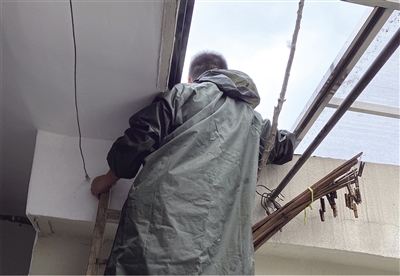 涌金门社区书记马翔在接到万阿姨的求助后,立即冒雨上门查看情况。室外大雨如注,铺天盖地倾泻而下,马翔赶到时,发现水珠已慢慢顺着天花板向万阿姨家里面渗过去了。“可能是天沟里垃圾沉淀,导致排水不畅通。”马翔根据工作经验快速判断道,“加上连日的大暴雨很可能使天沟成了一个大蓄水池。”
