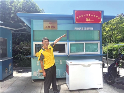 放完水,这位刚刚荣获“全国职工职业道德建设标兵个人”称号的小伙,从一旁取出一大张红色的贴纸,仔仔细细地贴在冰柜后面的小屋上——试运行2天后,“清林爱心公益小哥驿站”正式挂牌。红色的招牌紧挨着一直悬挂于此的“工会驿站”牌匾。“工会为我提供了场地、冰柜,还有部分的饮用水。”彭清林说。