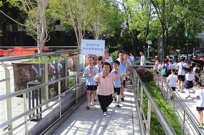 看完了垃圾分类点后,小小市民观察团又跟着景新社区残疾人代表王新枝走上了无障碍坡道。作为省无障碍社区,景新社区藏着不少无障碍设施,“原来这些小点点是盲文!”小小观察员们摸着坡道扶栏上的盲文,纷纷表示还要找找其他的无障碍暖心小细节。