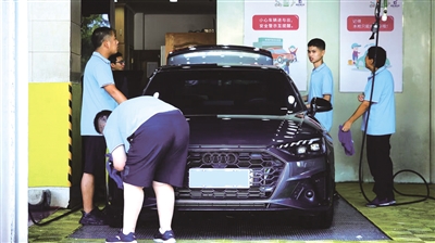 让孩子们学会这一系列洗车操作,并不容易。徐琴回忆,一开始洗车,孩子们时常做完一个步骤会忘记下面该做什么,愣在原地。为了教他们擦车,徐琴把毛巾分成了五种颜色,还编了首儿歌:“多色毛巾有分工,外表用蓝色,门框用紫色,里面玻璃用红色,方向盘座椅用绿色,打蜡用棕色。”等把五种毛巾都用完,孩子们就知道,这辆车洗干净了。如今,他们已经很熟悉自己的分工。“干净、锃亮!”弯湾洗车行的常客林先生竖着大拇指说道。
