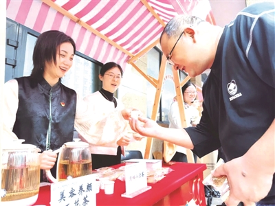 市集现场还设置了多个趣味体验摊位,展出了中药材、养生花茶、手工艺品以及婴幼儿辅食等,每个摊位前都是人潮涌动,“出摊”又“出圈”!在这样的氛围下,年轻人纷纷放下手中的“冰美式”,转而品尝起“新中式”养生茶,享受着这份独特的健康与雅致。