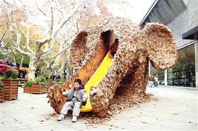 作品《秋天乐园》是一个小象滑梯,深受小朋友们的喜爱