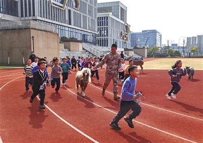 近日,杭州市东城外国语实验学校又热闹了起来。整齐的跑操队列中,一匹和孩子们一起奔跑的矮脚马格外引人注目。