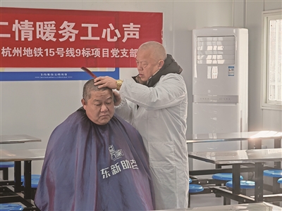 本报讯(凯旋街道) 近日,凯旋街道景秀社区党群服务中心联合街道“花花向未来·幸福来敲门”民生品牌的“乐居福”助力团,挖掘社区公益达人,组织了一场精心准备的理发活动,为中铁四局杭州地铁15号线景芳站的一线工人们“送福上门”。