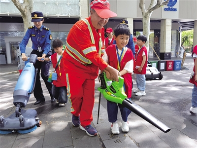 在环卫叔叔阿姨的示范带领下,孩子们操作起了新式的现代清洁工具。有的推着滚轮式树叶清扫车,把落叶们轻松收入;有的提着强力吹风筒,把杂物“赶”出花坛和地缝;有的盯着清扫车前后左右四个清洁盘,研究着垃圾到底藏哪儿了……