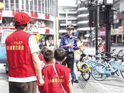 “滴滴滴,这里是小小城管1号,前方发现‘迷路单车’,请求支援!”在指挥中心,孩子们认真地看着智慧监控平台画面,寻找城市潜在的“问题”,拿着对讲机向路面巡查人员“派发任务”,直到画面里摆放杂乱的单车被清理整齐后,“小城管”们才放心地露出笑容。