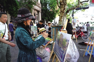 油画爱好者集聚在中山中路,用画笔捕捉市井生活的点滴