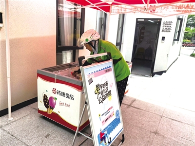 小哥驿站前设有“红驿冰立方”爱心冰箱,由九天环北服饰城和祐康联合赞助,为快递、外卖小哥等新就业群体免费提供消暑冰棍。