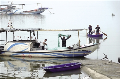 “今年上了35张网,比去年还要多2张。”王林海一手拎着渔网,一手朝记者比画了个“2”的手势。他是九堡现有27名渔民的捕鱼队队长,在钱塘江上已经打拼了40多年。