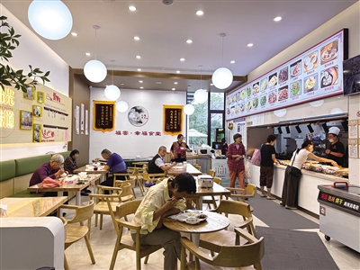 中午11点,清凉的室内,山药排骨汤的香气率先飘出。老人们刷身份证的“嘀嘀”声此起彼伏。在这里,60至79岁打八折,80岁至90岁打七折,90岁以上有五折优惠。他们的餐盘里,是特意烹饪得软烂适口的米饭和少油少盐的清淡小炒。