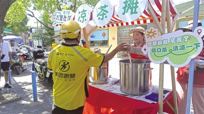 内容:爱心凉茶摊为外卖、快递小哥、环卫工人等户外工作者提供免费解暑凉茶。让居民群众在酷暑中享受清凉,拉近邻里距离。