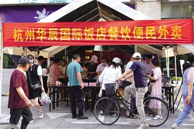 杭州华辰国际饭店尝试外摆模式,既给不想下厨的居民提供了方便与实惠,也为自身拓展了销售渠道。“我们推出这个外摆摊位主要是为了方便大众,在下班路上就能顺便把晚餐解决。”华辰国际饭店餐饮部经理表示。