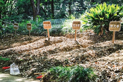 从分散到集中,林地“化零为整”,更要“见绿生金”。“我们计划通过发展林下经济,带动区域农林、科技、文旅、康养等一、二、三产融合发展。”丁兰街道沿山村党总支书记、村委会主任金华荣说,今年4月,村里引进“产学研合作中心”,拿出约200亩土地,在童子山百草园试水林下中药材种植。