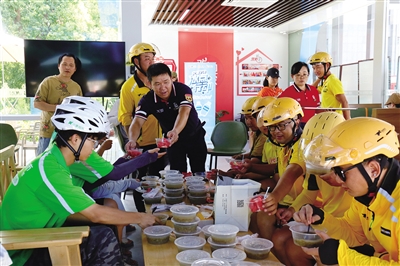 大塘加能站经理吴海锋介绍,驿站每年夏季都会开展送清凉活动。此次不仅为外卖骑手准备了20份内含红牛、日用品及冰淇淋兑换券的“清凉大礼包”,网约车司机、环卫工人、交警等户外工作者同样能在驿站享用到“四个一”的即时关怀:一碗西瓜、一碗绿豆汤、一瓶水和一支棒冰。