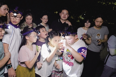 现场,孩子们或静听自然,记录下知了的鸣叫、树叶的婆娑及湖边青蛙的合唱;或微光寻踪,探寻草丛树木间的夜行生物,画下生动的自然笔记。等到打卡完毕,各组“夜探奇兵”皆是收获满满。蒲彦冰陪同女儿一路打卡观察,连自己也从中拓展了不少生物知识,“孩子在夜探过程中不仅了解到公园中飞蛾、蚂蚱等常见夜行小生物的特征习性,更重要的是能习得生物与生态之间的依存关系。”