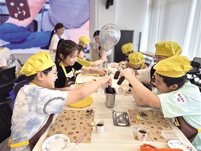 接下来,孩子们系上小围裙,在专业老师指导下,将牛奶棒冰蘸上美味的巧克力脆皮,再自由添加巧克力豆、可爱饼干碎等各类食材,“我要做五彩的!”“我的要加满巧克力!”童言童语中,一场“冰淇淋创意大赛”火热展开。现场一片欢声笑语,空气中弥漫着甜蜜的奶香。孩子们不仅可以把做好的爱心棒冰带回家,还现场品尝了自己做的创意冰淇淋,大家吃得满嘴奶油和巧克力,幸福感和成就感满满。