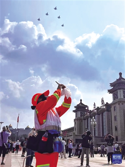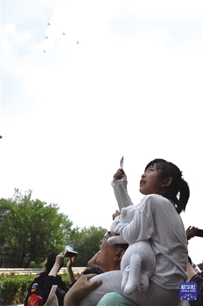 9月3日,纪念中国人民抗日战争暨世界反法西斯战争胜利80周年大会在北京隆重举行。这是市民在观看空中梯队。 新华社记者 陈浩明 报道员 张天宇 摄