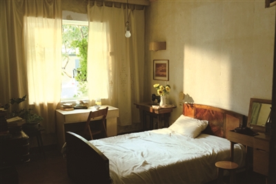 推开102室的门,仿佛时光倒流。暗红色木地板泛着岁月光泽,门头悬挂着玻璃珠帘,墙上贴着旧画报,老式电风扇一看就转起来会“嗡嗡”响,还有一台保留原样的缝纫机……一切仿佛定格在上世纪八十年代。