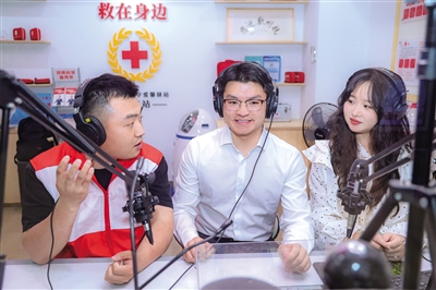 邀请我区第60例造血干细胞捐献者王超(中)做客华语之声演播室分享捐献心路历程