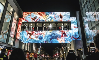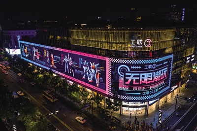 位于平海路与东坡路交叉口,有一座“西子廊桥”,如今已是商圈人气“顶流”。这座连接湖滨银泰A区与D区的连廊,白天化身为裸眼4D实景互动大屏,当夜幕降临,则化身梦幻剧场,2400平方米的超大LED户外3D大屏带来震撼的视听盛宴,高峰期单场活动吸引两万人驻足。