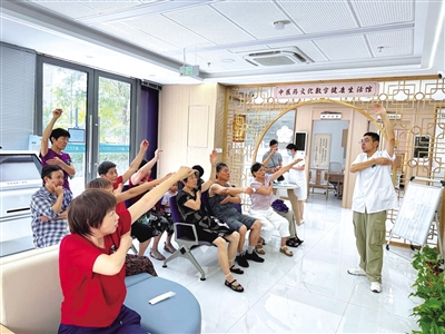 最热闹的要数中医互动区——五音疗愈区里,几位居民扫描二维码听着舒缓的古琴曲,配合呼吸放松;药食同源区的柜子里,小朋友们正跟着中医师学习包香囊,鼻尖飘着艾草、丁香的清香;健康宣教区的大厅里,十多位居民跟着中医师学“拍八虚”养生操……