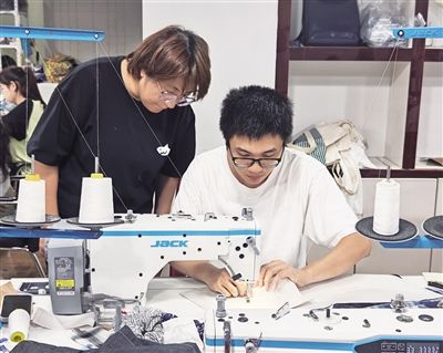 吕杭(右)指导学员使用缝纫机