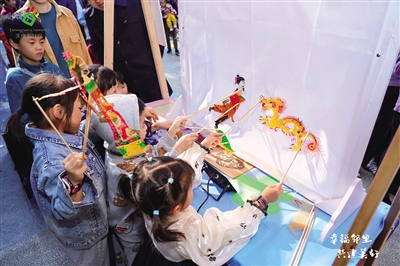 潮玩节并非只有“未来式”。在非遗文化体验区,掐丝珐琅摊位前,孩子们在传承人指导下,用细铜丝勾勒图案、填充釉料;拓印桌上,一张张带着朱砂印记的生肖拓片新鲜出炉;剪纸艺人指尖翻飞,瞬间剪出的机器人造型剪纸,引得众人称赞。皮影戏小舞台前更是被围得里三层外三层:幕布后,孩子们在手艺人指导下,学着操纵皮影角色,演绎经典故事;幕布前,其他小观众则看得津津有味。