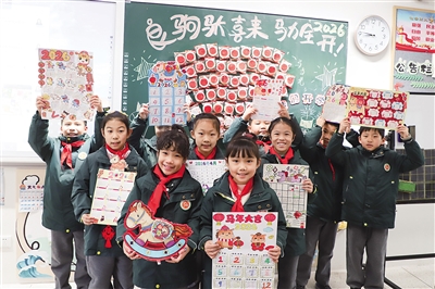 杭州市笕弘实验学校的学生们亲手制作马年日历,绘出对新学期的无限憧憬。